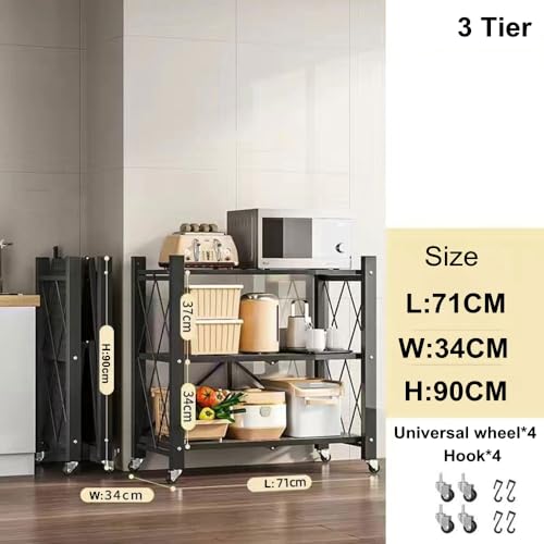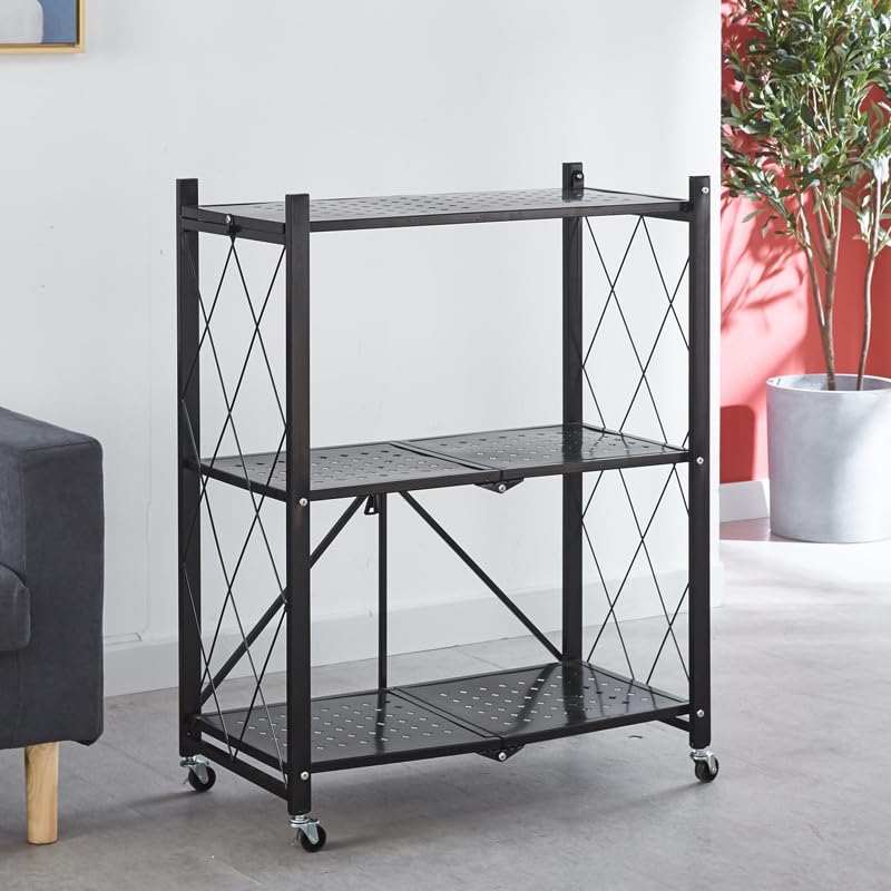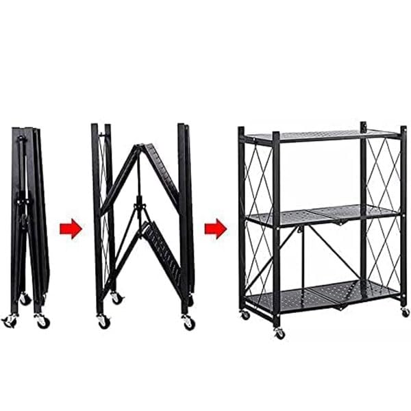 - This foldable storage shelf is easy to assemble. The 3-tier foldable storage rack arrives assembled, all you need to do is open the frame and adjust the Shelves on it,install four wheels.
