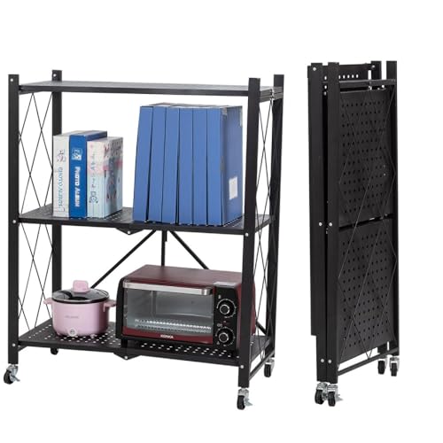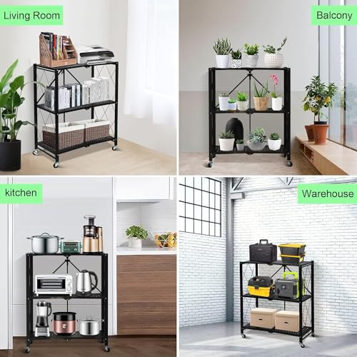 COOLBABY - COOLBABY Foldable Storage Shelves 3 Tier,Storage Organizer Rack with Wheels,Storage Shelves for Kitchen,Home,Office,Garden,Black