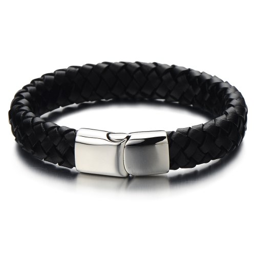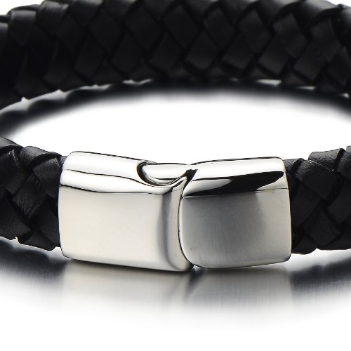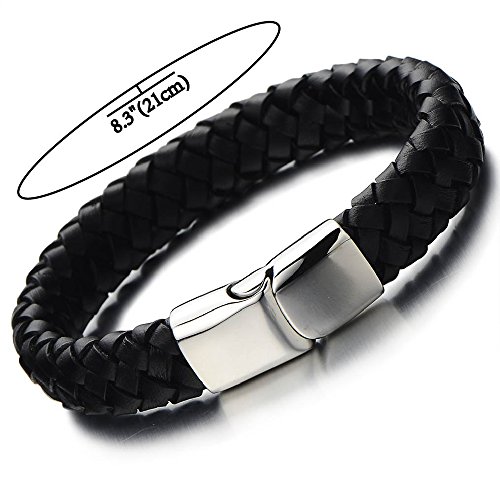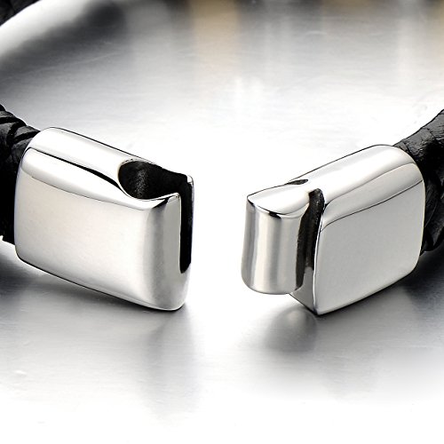 COOLSTEELANDBEYOND - COOLSTEELANDBEYOND Wide Black Braided Leather Bracelet for Men Genuine Leather Wristband with Magnetic Box Clasp