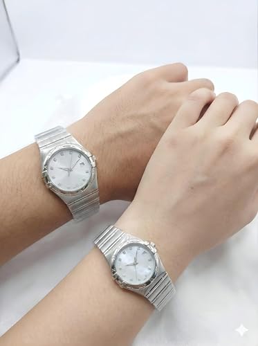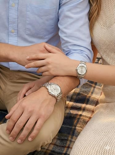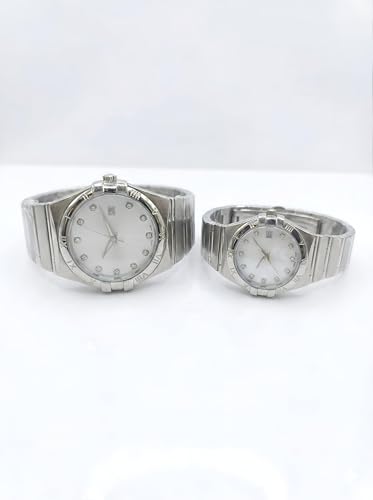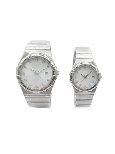 Generic - Coordinated Watch Set - His and hers stainless steel timepieces with mother of pearl dials, crystal marker details, and practical date display function.