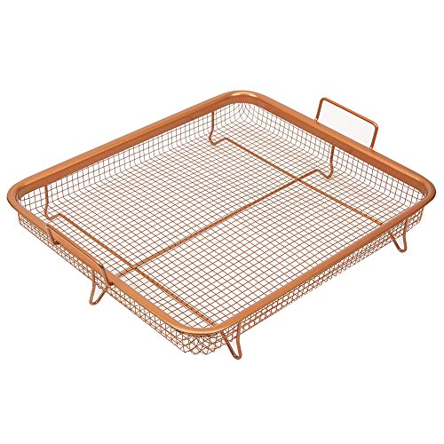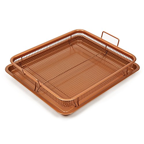 - 2-Piece Copper Chef Copper Crisper set includes 13 x 9-inch nonstick cookie sheet with 12 x 9 inch elevated nonstick crisper basket for air fry crisping, baking, and roasting