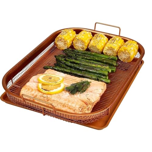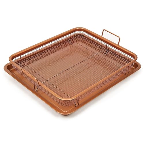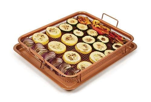 - WHAT'S INSIDE THE BOX - Inside the box, you'll find a set of basket and tray from Copper Chef. The tray measures 9.5"L x 13."W; The cookie sheet has materials of aluminum with chef-grade nonstick coating, and the mesh tray has materials of stainless steel with chef-grade nonstick coating.