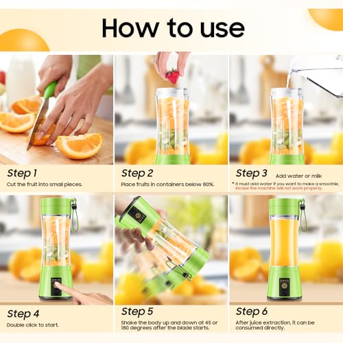- 【استخدم الخطوات بشكل صحيح】الخطوة 1: قطع الفاكهة إلى قطع صغيرة وأضفها إلى حوالي 80% من الكوب. الخطوة 2: أضف الماء أو الحليب، وإلا فلن يعمل بشكل صحيح. الخطوة 3: اقلب الجهاز رأسًا على عقب حتى تكون الشفرات مكشوفة بالكامل. الخطوة 4: انقر نقرًا مزدوجًا على مفتاح التشغيل. الخطوة 5: أدر الشفرة لمدة 1-2 ثانية، ثم ضع الماكينة في وضع مستقيم وهز الماكينة أثناء العصر.
