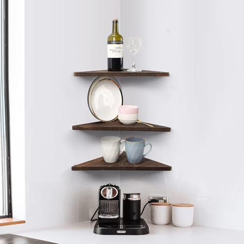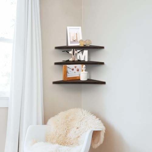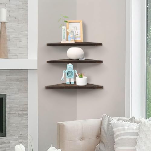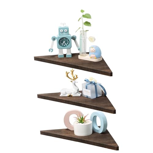 HIKKY - Corner Floating Shelves Set of 3, Triangular Wall Mounted Wooden Display Shelf, Wood Wall Storage Organizer Shelves for Wall Decor, Bathroom, Kitchen, Bedroom, Living Room, Office (Dark Brown)