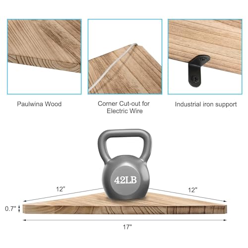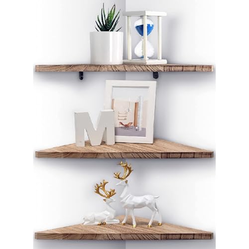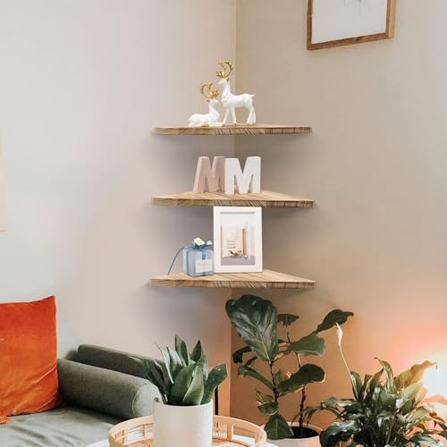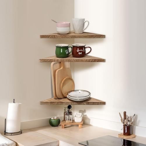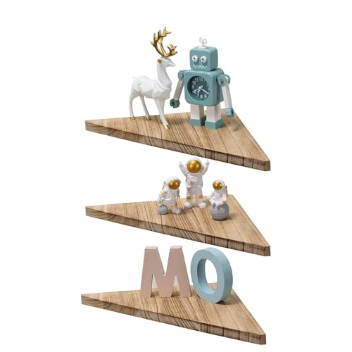 HIKKY - طقم رفوف زاوية عائمة مكون من 3 قطع، رف خشبي مثلثي مثبت على الحائط للعرض، منظم تخزين خشبي للجدار للديكور والحمام والمطبخ وغرفة النوم وغرفة المعيشة والمكتب، (بني فاتح)