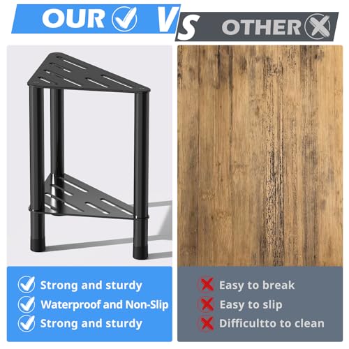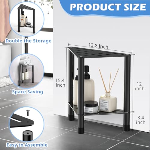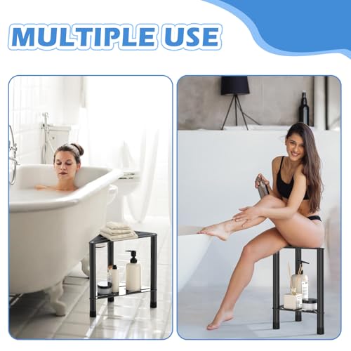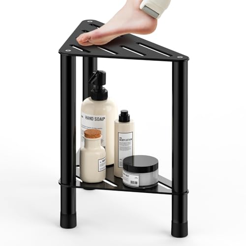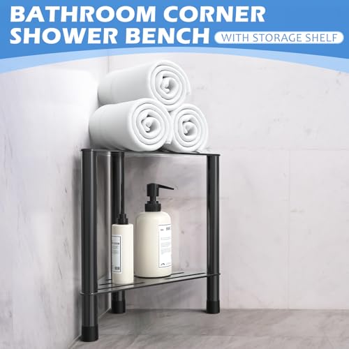HzTinT - مقعد دش زاوية للدش الداخلي - مسند قدم للاستحمام 15.5 انش مع رف تخزين، مقعد دش من الستانلس ستيل لحلاقة الساقين، مقعد حمام مناسب لمساحات الاستحمام الصغيرة، اسود