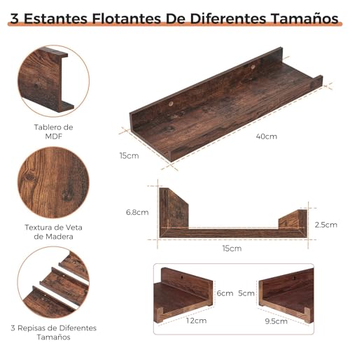 COSENGA - Floating Shelves Wall Mounted Set of 3 Floating Wall Shelves 40cmx15cm Decorative Hanging Display Support Up to 10kg, Floating Storage Shelf for Kitchen Living Room
