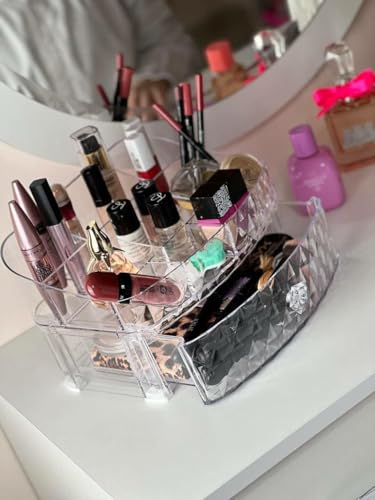 - This transparent organizer is designed to display and neatly arrange makeup brushes, lipsticks, and jewelry items such as earrings. With multiple slots and one large drawer, it provides a versatile storage solution that keeps everything visible and easily accessible in one compact piece.
