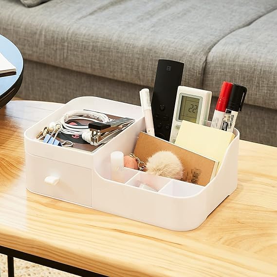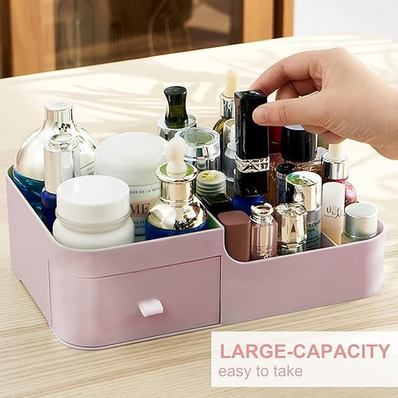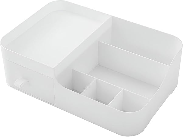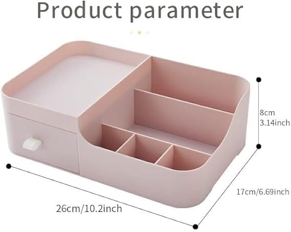 - منظم المكياج هذا مع درج ورف، مصمم وفقًا لمعايير الصناعة، يحقق علامات عالية من حيث الوظائف. المواد عالية الجودة المستخدمة في هيكلها تجعلها متينة، وتتميز بستة مساحات تخزين ودرج - متوفرة بألوان متنوعة.