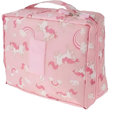 - This travel makeup bag features a charming unicorn and rainbow pattern in soft pink tones, designed to bring a whimsical and joyful aesthetic to your beauty essentials, appealing especially to younger users who love playful, fantasy-inspired designs.