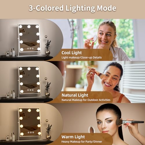 - 💖3 Color Lighting Modes: The light up mirror come with 3 color lighting modes: white, yellow, white+yellow, allow you to see how exactly your makeup will look in various lighting situations like daytime, evening, home and office environments, creating suitable makeup for daily, party, business and so on.