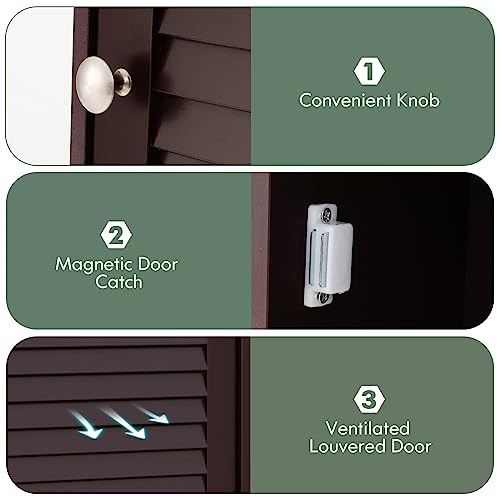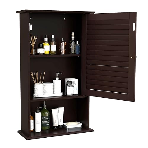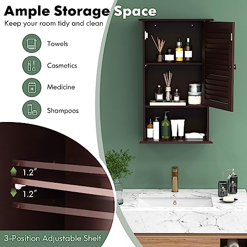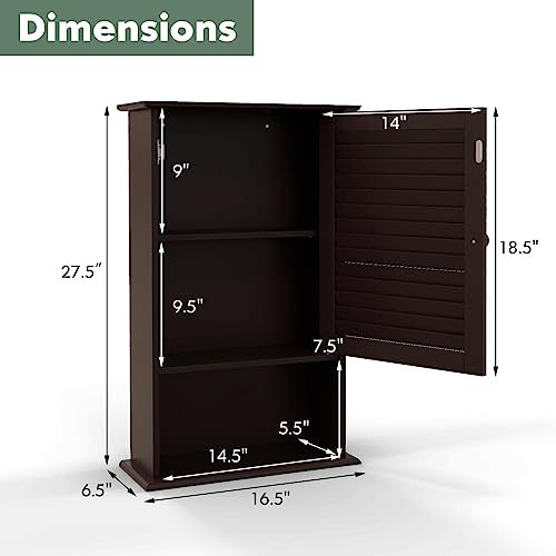 COSTWAY - دولاب حائط للحمام بسعة تخزين كبيرة مزود بباب شبكي مفرد ورف قابل لتعديل الارتفاع مصنوع من الخشب للأدوية للاستخدام في الحمام وغرفة المعيشة والمطبخ من كوستواي، لون بني