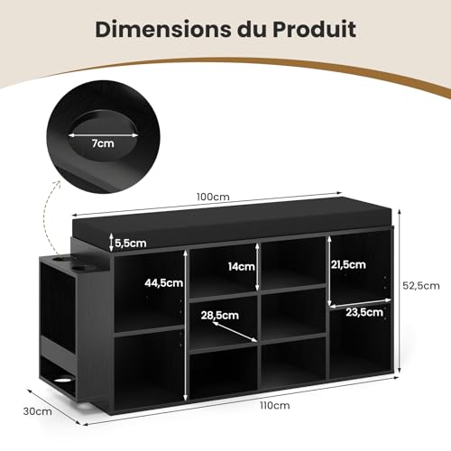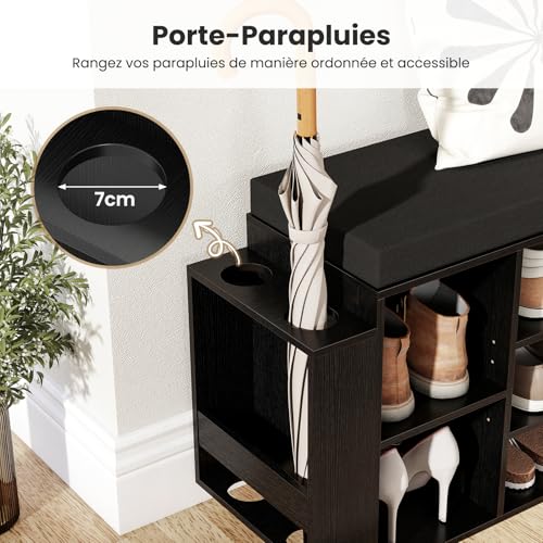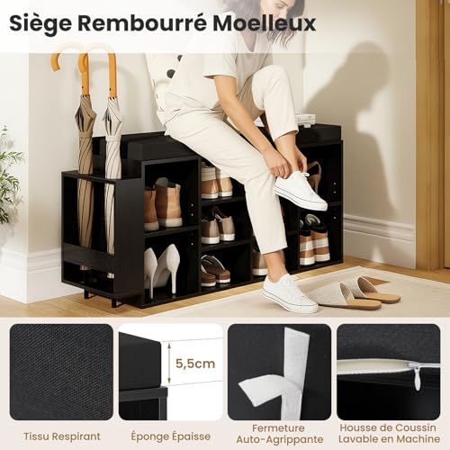 COSTWAY - COSTWAY Entrance Shoe Bench with Umbrella Holder, Storage Bench with Cushion, 10 Compartments, Adjustable Shelves to 5 Positions, Washable Cushion Cover, 110 x 30 x 52.5 cm (Black)