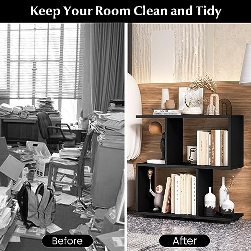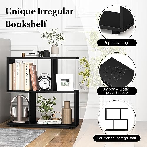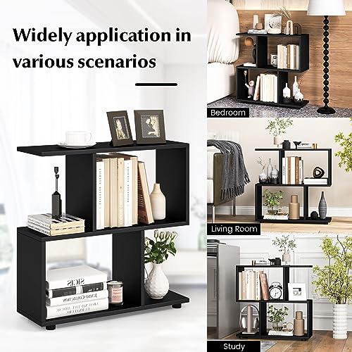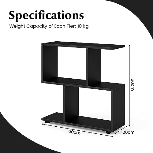 COSTWAY - COSTWAY Wooden Bookshelf, 2-Tier Freestanding Storage Bookcase with 4 Compartments, S-Shaped Display Shelf Open Rack Shelving Unit for Living Room, Bedroom and Office (Black)