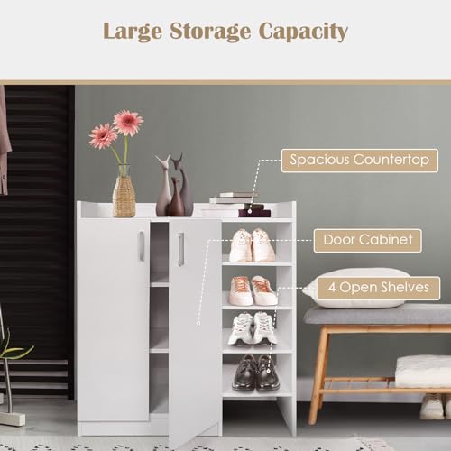 - 【Ample Storage Solution】This shoe cabinet features a 2-door cabinet and 4 open shelves, providing ample space to organize various types of shoes. The spacious countertop is perfect for placing handbags, keys, or decorative items.