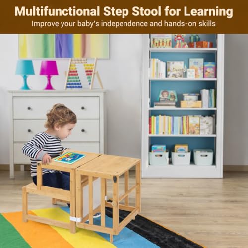 COSYLAND - كوزد لاند برج قائم 3 في 1 للاطفال الصغار مع سبورة بيضاء، مقعد مطبخ للاطفال قابل للتحويل الى طاولة مكتب وكرسي، مساعد مقعد مطبخ للاطفال الصغار مع شهادة FSC، CPC، SOR وCE - طبيعي