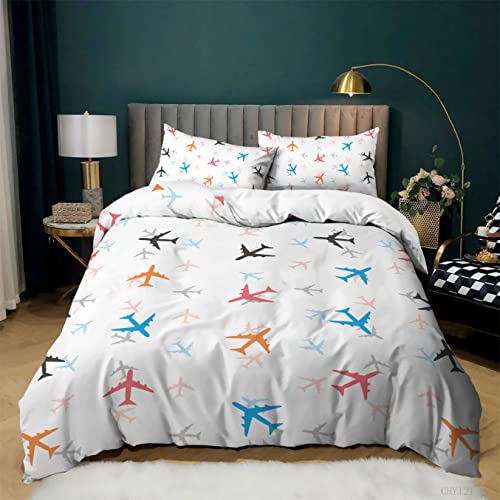 YRGERATON - طقم غطاء لحاف قطني ناعم من المايكروفايبر للاطفال حديثي المواسم بنمط طائرة كرتونية 3 قطع جيد التهوية وخفيف الوزن للاولاد والبنات (غطاء لحاف 71 انش × 87 انش) طائرة ايه، بوليستر، سادة