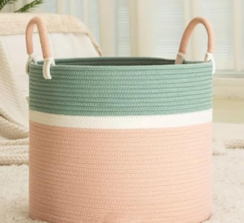 Generic - Cotton Rope Storage Basket, Large Decorative Woven Basket with Handles, Pink and Sage Green Color Block Design, 40cm wide 35cm hight