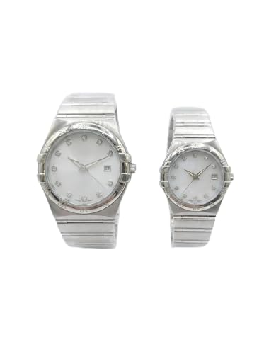 Generic - طقم ساعات للازواج - ستانلس ستيل فضي مع مينا من عرق اللؤلؤ ومؤشرات كريستالية وعرض التاريخ.