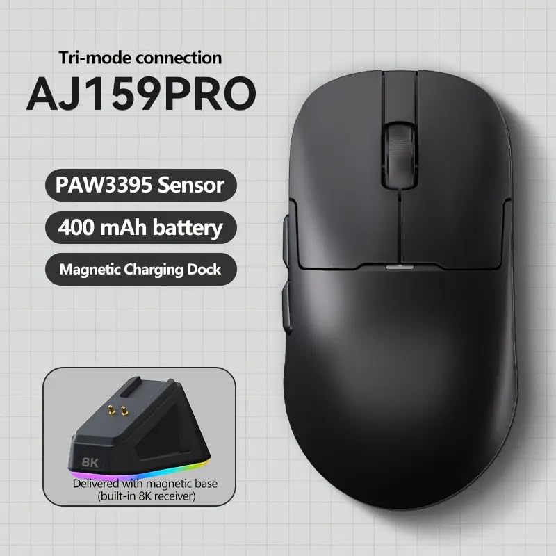 - [Advanced Tri-Mode/Dual-Mode Connectivity & High Shin Speed] AJAZZ AJ159 Series supports seamless switching between Bluetooth, 2.4GHz wireless and wired connections. Uniquely delivers 8000Hz in wireless mode and 1000Hz nock speed in wired mode (AJ159/159P: 1K Wired and Wireless) delivers instant feedback and smoother cursor action by delivering ultra-low response time of 0.125ms, eight times faster than standard gaming mice.