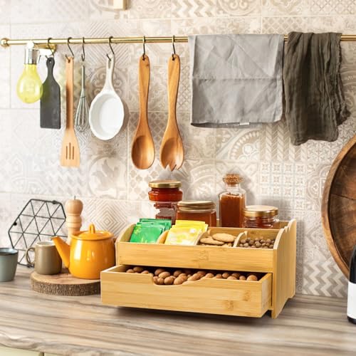 - Smart Organization: No assembly is required. With one spacious drawer and 5 compartments, this multifunctional organizer keeps your coffee pods, coffee syrup, coffee cups, tea bags, sugar packets, and other essentials neatly arranged. The thoughtful layout maximizes space efficiency on countertops or bars.