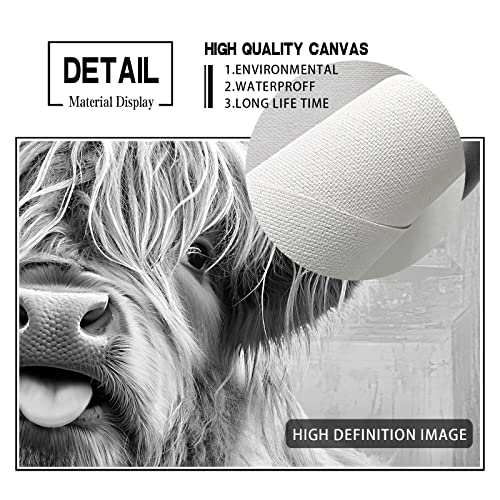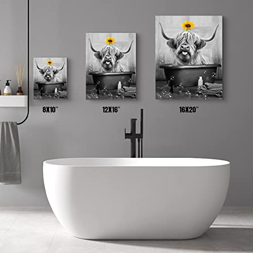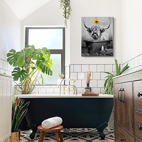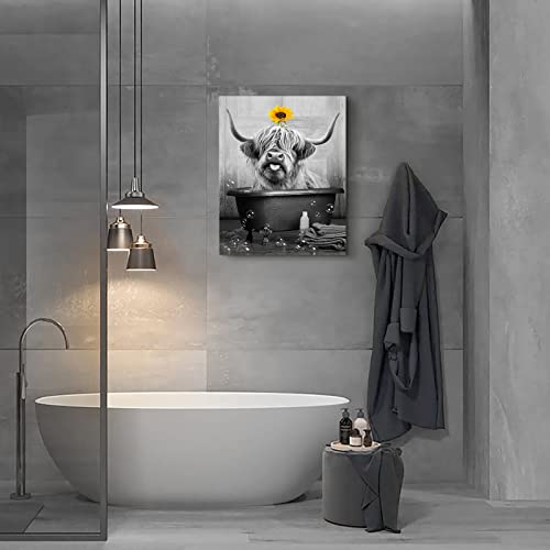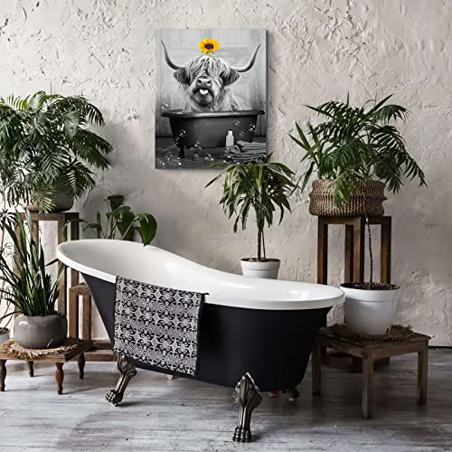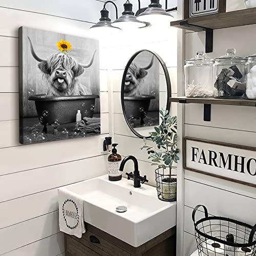 SHAKLAK - لوحة فنية جدارية لطيفة من قماش بقرة هايلاند عباد الشمس مطبوعة باللونين الاسود والابيض ديكور حائط حوض الاستحمام اعمال مضحكة لديكور المنزل والحمام وغرفة المعيشة النوم باطار جاهز