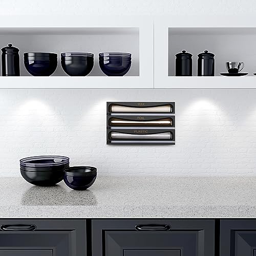 Cozee Bay - Cozee Bay Bamboo Wrap Dispenser with Cutter, Plastic Wrap Organizer, Aluminum Foil Organization, and Wax Paper Dispenser Holder for Kitchen Drawer and Wall, Compatible with 12" Roll (01 Black)