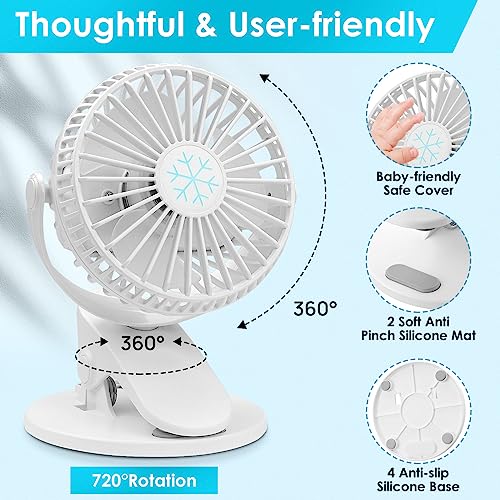 - مدمجة وآمنة - تم تصميم المروحة بمشبك لتكون صغيرة الحجم وسهلة الحمل (6.7 × 6.3 × 2.1 انش). آمنة للاستخدام حتى للأطفال الرضع والأطفال الصغار، مما يحمي الأصابع الفضولية من تحريك شفرات المروحة. تصميم سهل الاستخدام يسمح للأمهات باستخدامه بثقة.