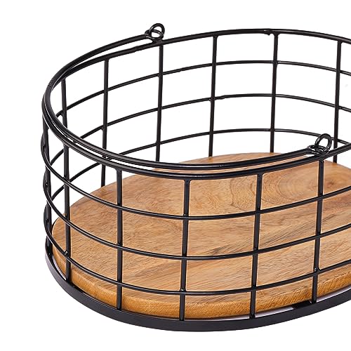 Craft Brio -A TRENDY HANDICRAFTS - Metal Wire Black Basket With Wooden Base Fruit Vegetable Holder Diwali Gifting Decor Oval Shape Long Handle