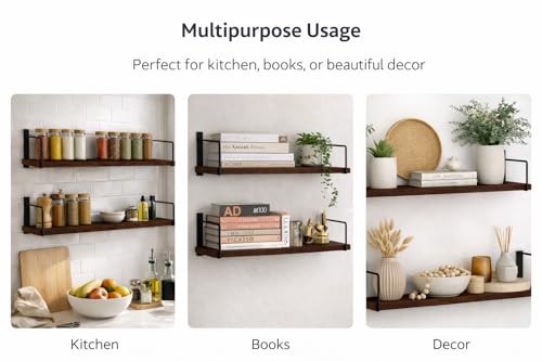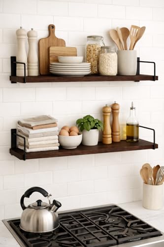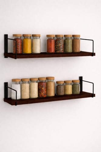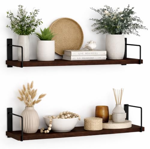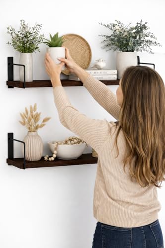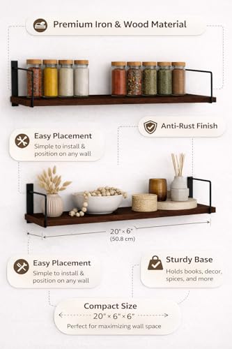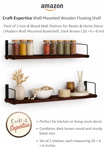 Craft Expertise - رف خشبي عائم يثبت على الحائط - عبوة من 2 رف حائط من الحديد والخشب للكتب وديكور المنزل | رف كتب عصري يثبت على الحائط، بني داكن | 20 × 6 × 6 انش