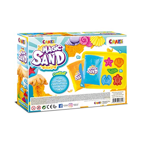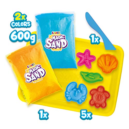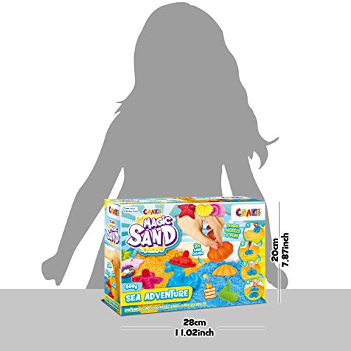 - The Magic Sand Sea Adventure craft set children contains 300 g of magic sand in 2 colours (blue and yellow), 5 moulds, a modelling spatula and a play tray. This allows you to model shells, octupuses and other sea creatures