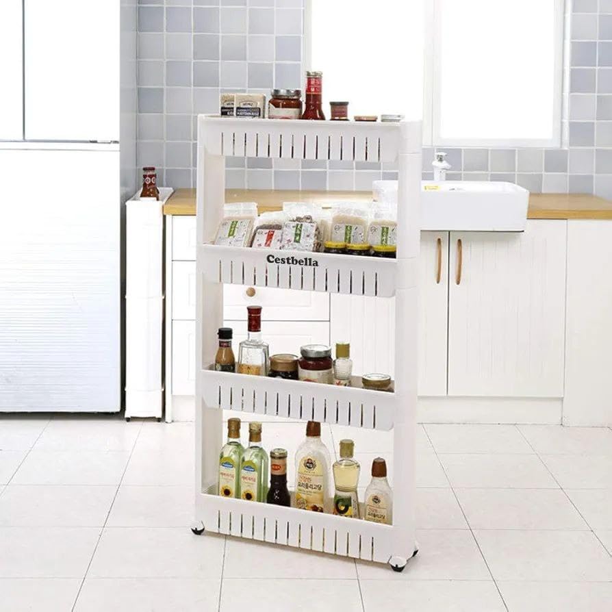 - Genius Space Saving Geometry This trolley is carefully designed to maximize the smallest spaces, based on a durable vertical structure that allows for a wide variety of tools and supplies to be stored without taking up space Positions easily by the fridge, in the bathroom, in the kitchen, or even in the balcony, turning neglected corners into a functional, organized storage.