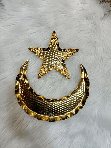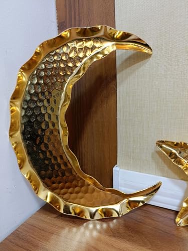 - طقم أطباق تقديم بتصميم هلال ونجمة، مثالي لتقديم التمر والمكسرات والحلويات على سفرة رمضان والأعياد. تصميم رمضاني أنيق وجذاب لون ذهبي لامع يضيف لمسة فاخرة خامة متينة وجودة عالية مناسبة للتقديم أو كديكور راقي