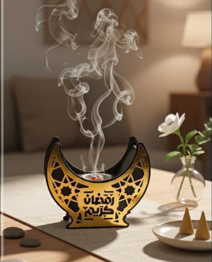 - تصميم إسلامي فريد: حامل بخور على شكل هلال مزين بزخارف إسلامية هندسية جميلة مع كتابة عربية، يضيف لمسة روحانية وجمالية لديكور منزلك