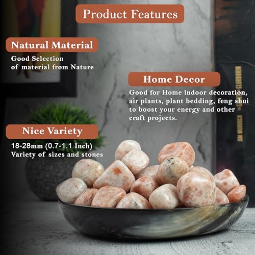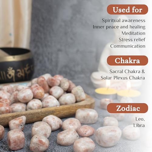 - Tumbled stones : These lovely Sunstone tumble stones are handcrafted in India. The set contains a bunch of 1 LB tumbled stones with a pouch, a crystal guide and a Thank you card. Perfect for crafts, home decor, lapidary, jewellery making, cabbing, and cutting.