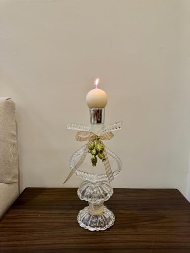 Generic - Crystal Glass Candle Holder with Gold Ribbon Accent, Decorative Vintage Style Candlestick, Clear Glass with Holiday Theme Ornaments