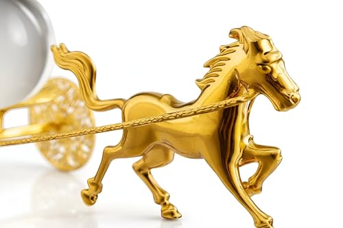 - An exquisite decorative sculpture featuring a magnificent golden horse in full gallop, pulling an ornate chariot embellished with intricate filigree patterns on the wheels and body; the luxurious gold coating and meticulous detailing create a striking focal point that adds timeless elegance to any interior setting, whether placed on a mantel, shelf, or office desk, instantly elevating the ambience with a sense of refined opulence and artistic craftsmanship.