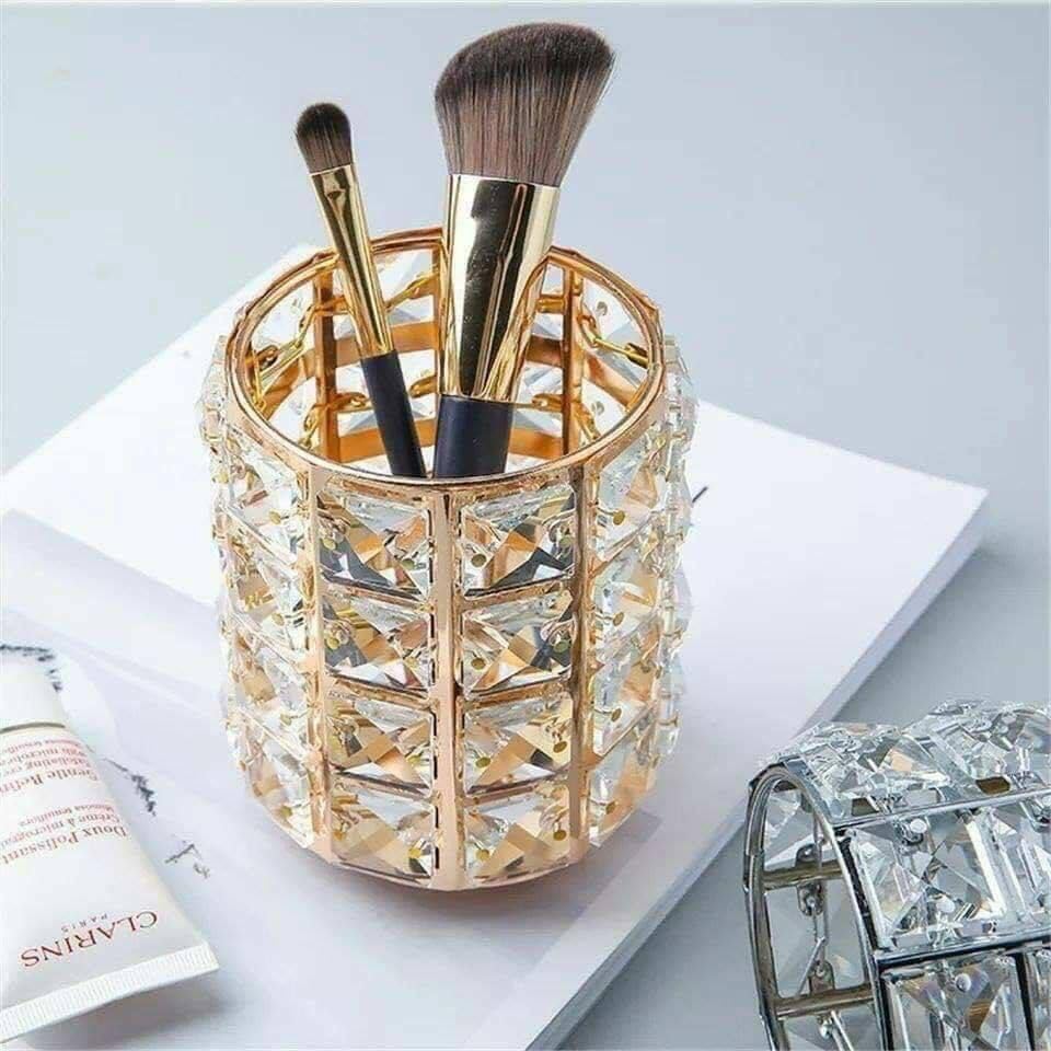 Generic - Crystal Makeup Brush Holder with Rose Gold Frame, Decorative Cosmetic Organizer, Luxury Vanity Storage Container (Silver)