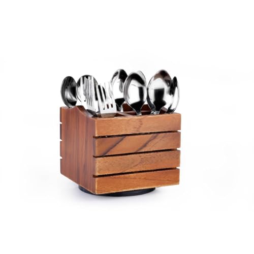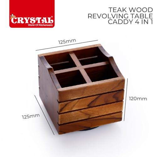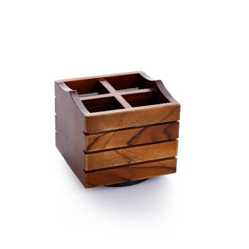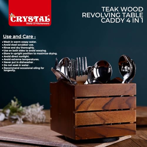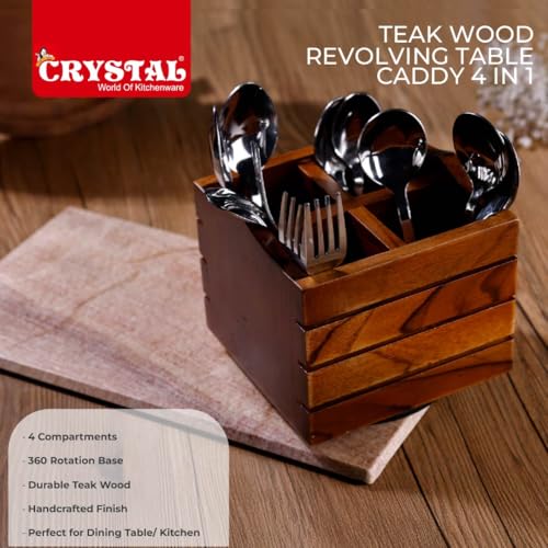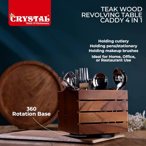 Crystal - Crystal Premium Handcrafted Wooden Revolving Cutlery/Spoon stand | Pure Teak Wood | Wooden Caddy with 4 sections | Multipurpose Cutlery Stand for Kitchen, Dining Table