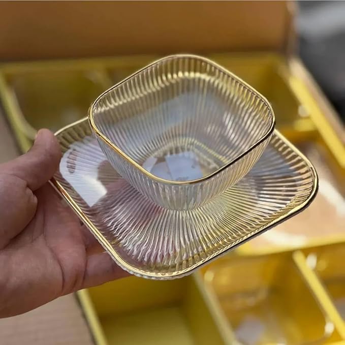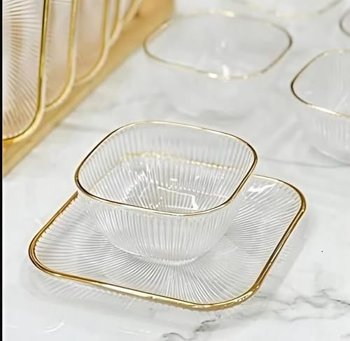 عام - طقم تقديم كريستال 12 قطعة بحواف ذهبية، أطباق وأوعية زجاجية شفافة بتصميم مخطط للحلويات والفواكه والسلطات