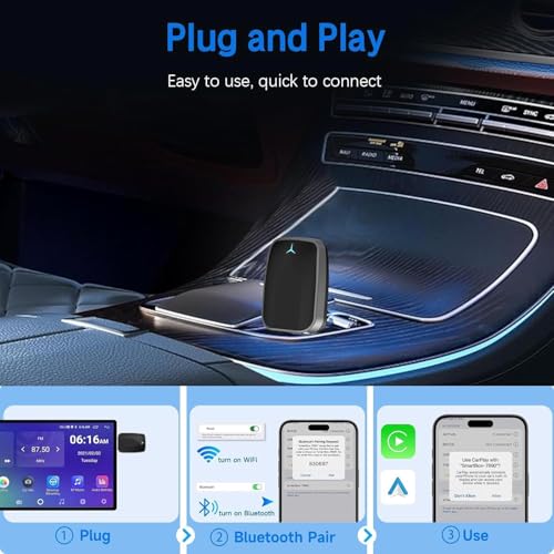 - Quick Setup & Smart Connection: Setting up the wireless CarPlay adapter is as simple as 3 steps and takes only 30 seconds. No additional drivers or apps are needed. Once set up, the adapter reconnects automatically every time you start your car, whether your phone is in your pocket, bag, or outside the vehicle. Set it up once and enjoy seamless connectivity forever. It requires no dashboard mounts—your phone can stay in your pocket while remaining fully functional.