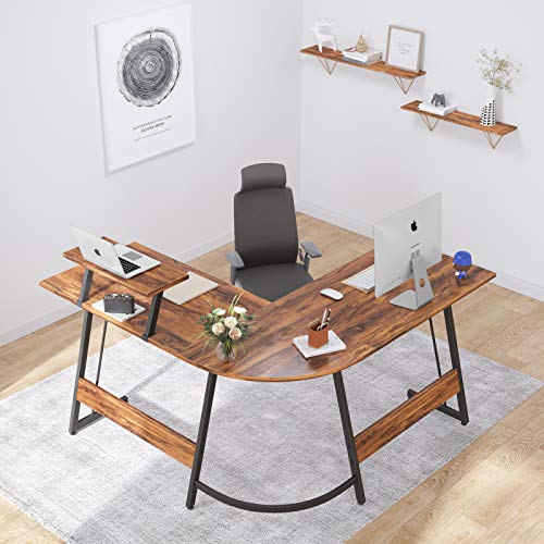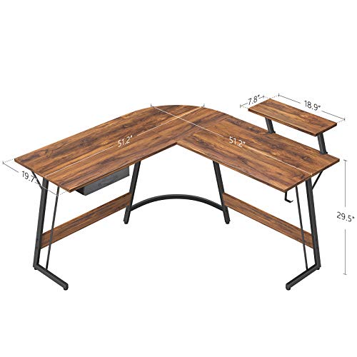 CubiCubi - مكتب على شكل حرف L، مكتب ألعاب زاوية للكمبيوتر مع حامل شاشة كبير، طاولة كتابة للمكتب 130 سم، محطة عمل مع درج تخزين، موفر للمساحة من كوبي كوبي، بنى غامق