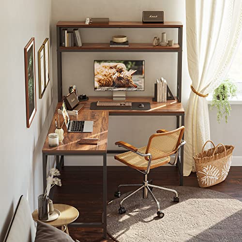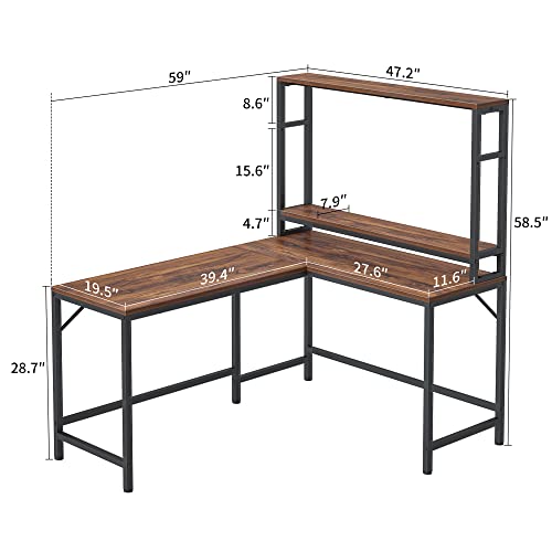 CubiCubi - CubiCubi L Shaped Desk with Hutch, 59.1" Corner Computer Desk, Home Office Study Writing Desk Computer Workstation with Two Tier Bookshelf, Deep Brown