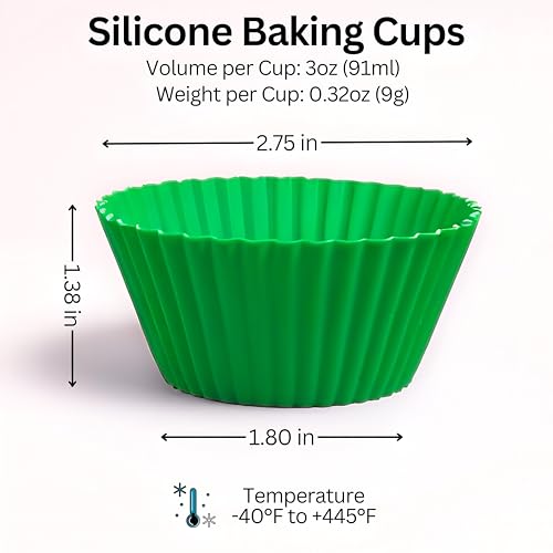- Our silicone baking cups are designed for comfort and versatility and feature a non-stick surface that eliminates the need for lubrication or spray. Measuring 2.75" in top diameter, 1.75" in bottom diameter and 1.25" in height, these cups can stand alone on baking sheet or fit perfectly in a standard cake tray, providing flexibility for various baking needs.