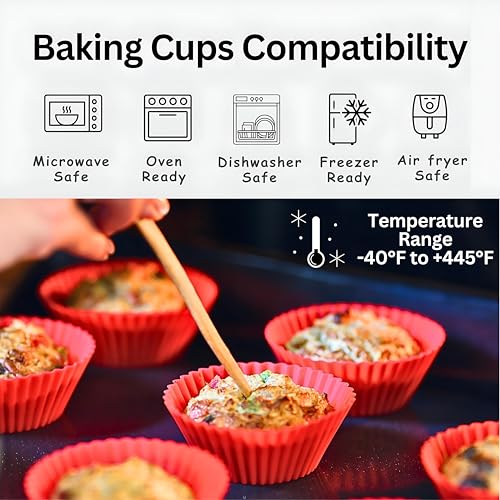 - These reusable silicone cups are safe for the microwave, air pan, dishwasher, freezer and oven, withstands temperatures up to 450 degrees F(230 degrees Celsius). This makes it a reliable choice for baking, heating, or storing food, providing peace of mind that it will work safely in different cooking appliances without compromising the safety of bakery.