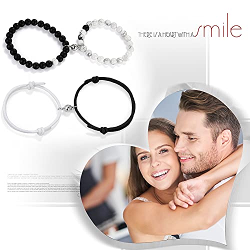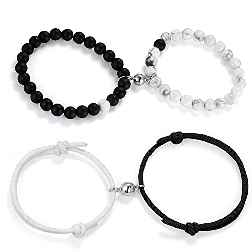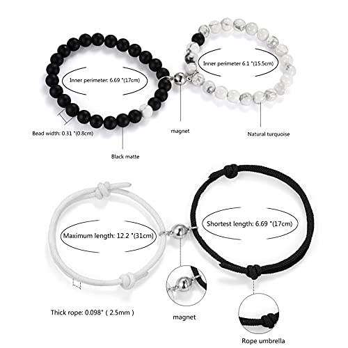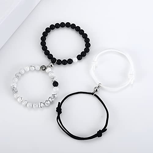 Cupimatch - Cupimatch 2 Pairs Magnetic Mutual Attraction Couple Bracelets, Adjustable Rope Braided Black Matte Agate &White Howlite Beads His and Hers Magnet Distance Relationship Bracelet, metal