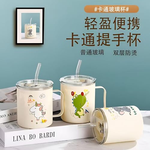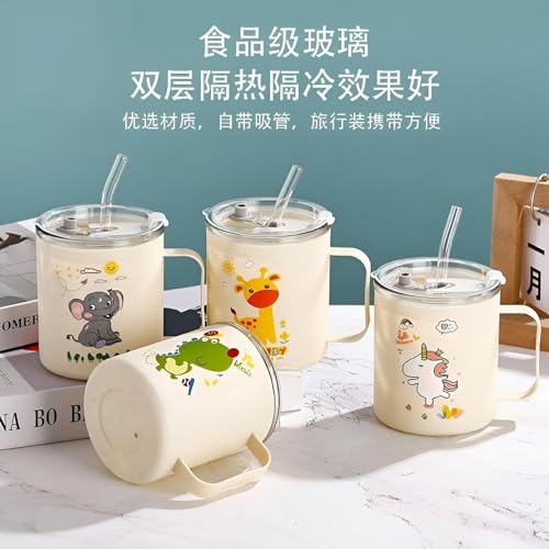 Generic - مج بتصميم حيوانات لطيفة - كوب قهوة زجاجي مزدوج الجدار مع ماصة، تصميم كرتوني، غطاء شفاف، مقبض محمول، مثالي للمشروبات الساخنة او الباردة (4 قطع)