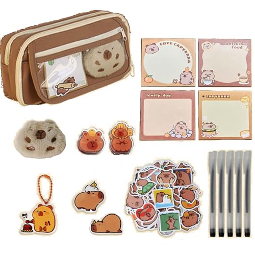 ACHHOME - مجموعة مقلمة لطيفة من كابيبارا، حافظة اقلام جمالية شفافة مع قطيفة ودبابيس ومقصورات متعددة الطبقات، سعة كبيرة للوازم المدرسية، بني، لطيف