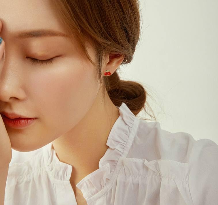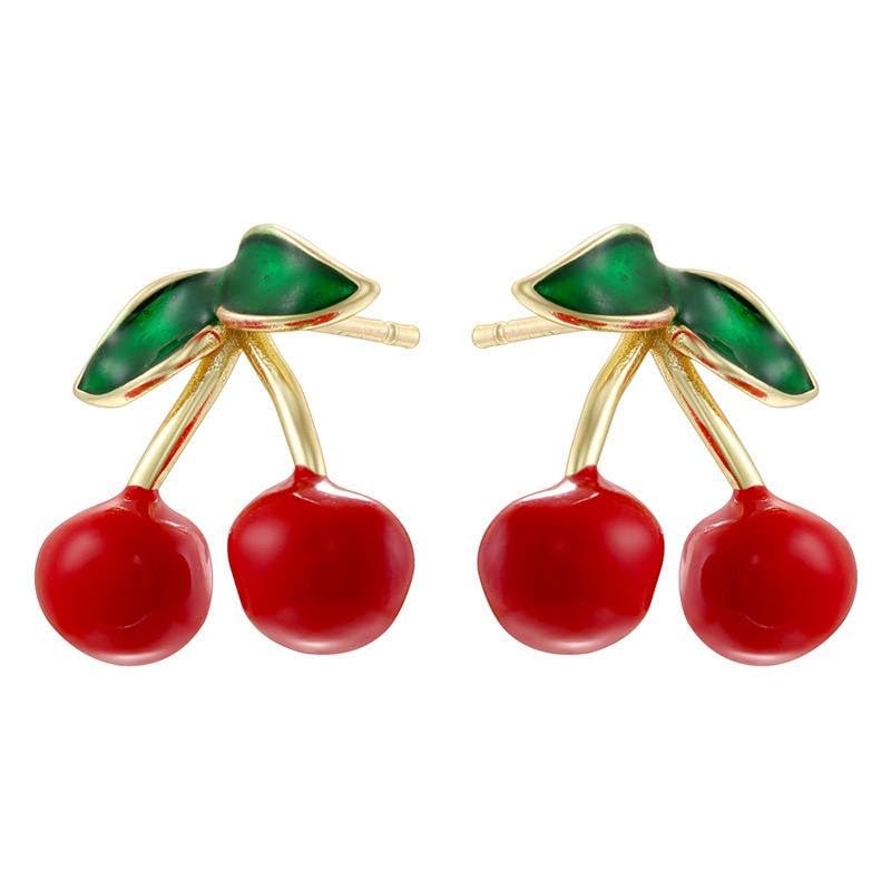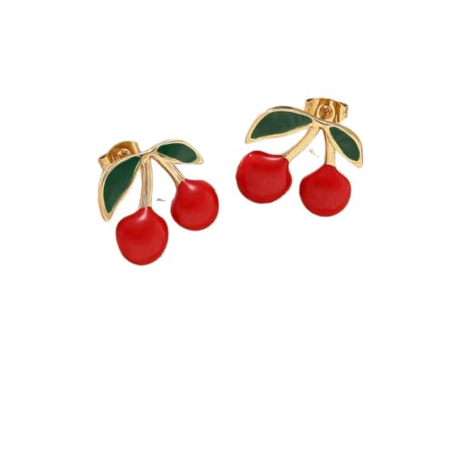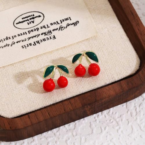 عام - Cute Cherry Stud Earrings for Women Girls – Red Enamel Fruit Earrings with Gold Tone and Green Leaf Design