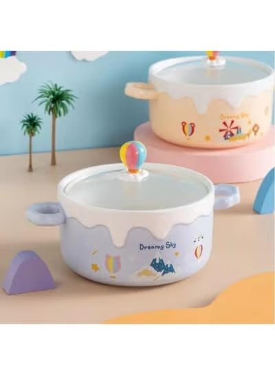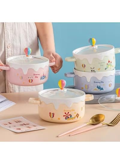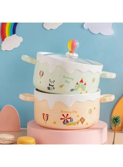 Generic - Cute Design Porcelain Ramen Noodle Bowl with Glass Lid, 500ml Liquid Capacity, with Side Handles for Noodles, Pasta, Sauces and Soups